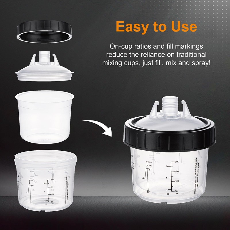 - SPFAST Disposable Paint Cups Kit:50 Disposable Cup Liners (6oz (200ml)): These liners are perfect for single use, eliminating the need for cleaning traditional cups. 50 Lids with 125 Micron Strainers: The lids ensure a mess-free operation and filter out any paint impurities for a smooth finish. 1Hard Cup with Retainer Ring: This reusable cup provides a secure base for the disposable liners and connects to your spray gun adapter. (not 2.0 series).