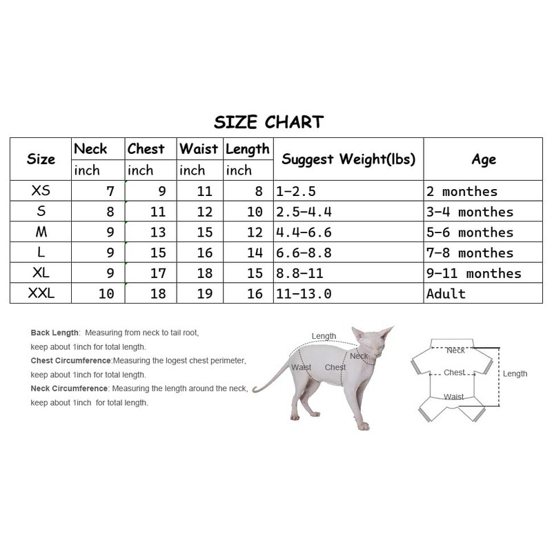 - 5. Size: For hairless cats, choose the appropriate size according to the size chart, and take one size larger for non-hairless cats.