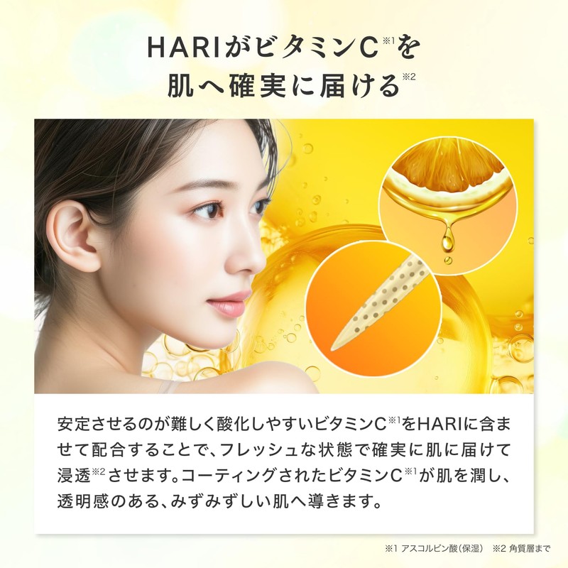 - HARI ensures that vitamin C *1 is delivered to your skin: By combining vitamin C *1 with HARI which is difficult to oxidize and stabilize it easily, it will deliver and penetrate to your skin in a fresh state. Coated Vitamin C*1 moisturizes skin and leads to fresh, clear skin. 1 Ascorbic acid (moisturizing) *2 Up to the stratum layer