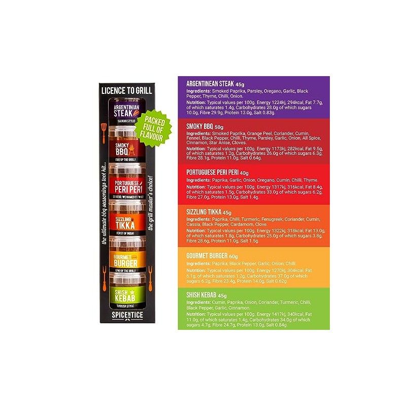 Product DescriptionRock the BBQ world with these 6 pots of delicious BBQ seasonings and rubs from around the world. Create delicious meals using our seasonings and become the king or queen of the BBQ! This set contains 100% pure herbs and spices, perfect for food lovers and food cookers.IngredientsArgentinean Steak (45g) Smoked Paprika, Parsley, Oregano, Garlic, Black Pepper, Thyme, Chilli, Onion. Smoky BBQ (50g) Smoked Paprika, Orange Peel, Coriander, Cumin, Fennel, Black Pepper, Chilli, Thyme, Parsley, Garlic, Onion, All Spice, Cinnamon, Star Anise, Cloves. Portuguese Peri Peri (40g) Paprika, Garlic, Onion, Oregano, Cumin, Chilli, Thyme. Sizzling Tikka (45g) Paprika, Chilli, Turmeric, Fenugreek, Coriander, Cumin, Cassia, Black Pepper, Cardamom, Clove. Gourmet Burger (60g) Paprika, Black Pepper, Garlic, Onion, Chilli. Shish Kebab (45g) Cumin, Paprika, Onion, Coriander, Turmeric, Chilli, Black Pepper, Garlic, CinnamonDirectionsRecipe and Direction for use inside of pack.Safety WarningKeep out of reach of children and pets. Not for under 16s.Manufacturer Contact Information6 Craven Street, Leicester, LE1 4BX