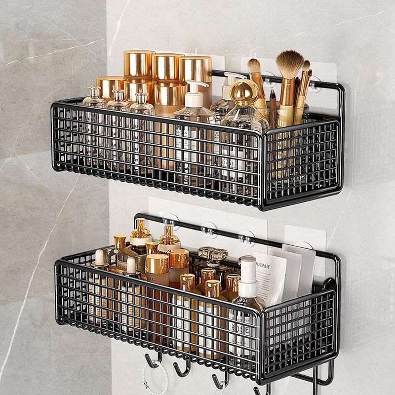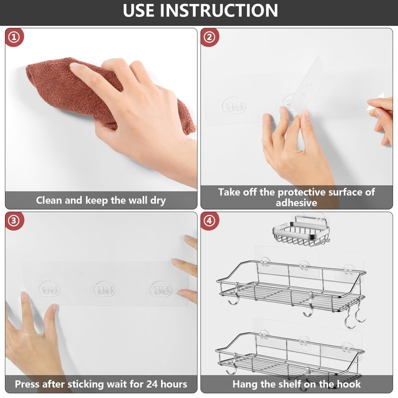 - Wide Application: The adhesive hooks can be applied on tiles, marble, glass,metal,smooth wood, metal, stainless steel surfaces, which is suitable for corner shelf basket, bathroom storage shelves, kitchen racks and soap holder.