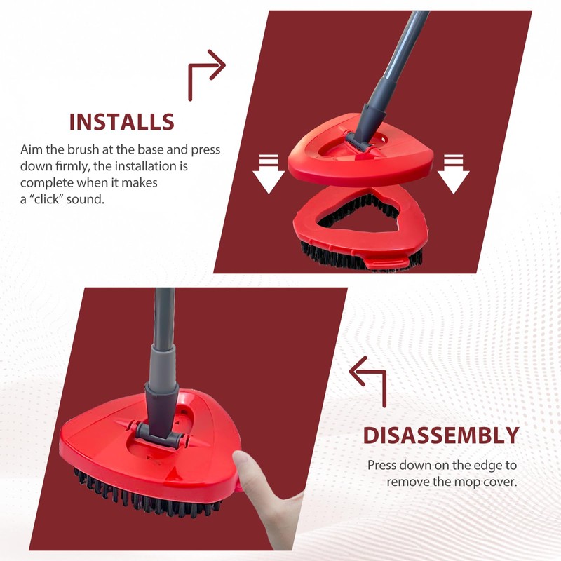 - [Easy Installation]: Vlieda scrub mop head installs easily— just align the brush with the mop base and press down until you hear a click, that means the installation is complete. After use, simply rinse it with water and let it air dry to keep it in good condition for future use.