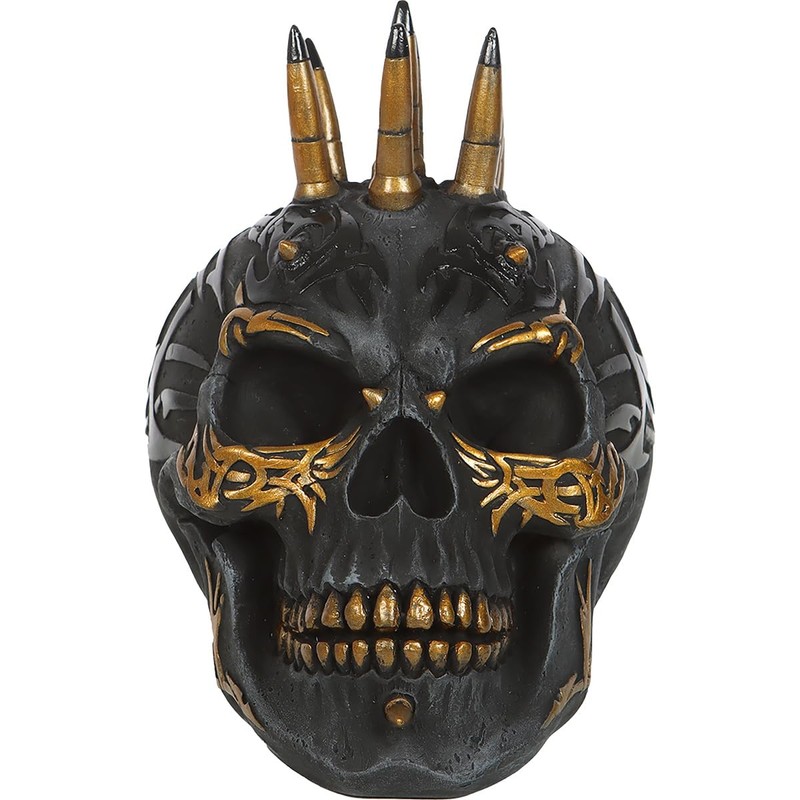 • 8-Inch Black Gold Skull: This 8-inch skull figurine with a bullet mohawk design is a collectible piece that commands attention and stands out in any collection.