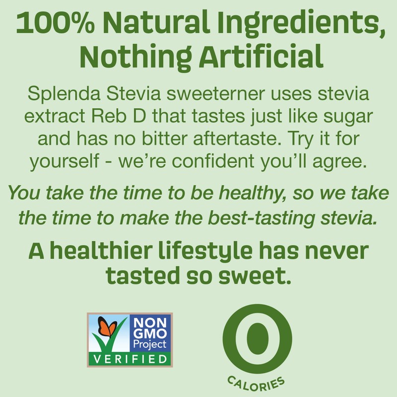 - 100% Natural: Splenda Naturals Stevia contains nothing artificial; No artificial flavors, colors or preservatives and is completely Non-GMO.