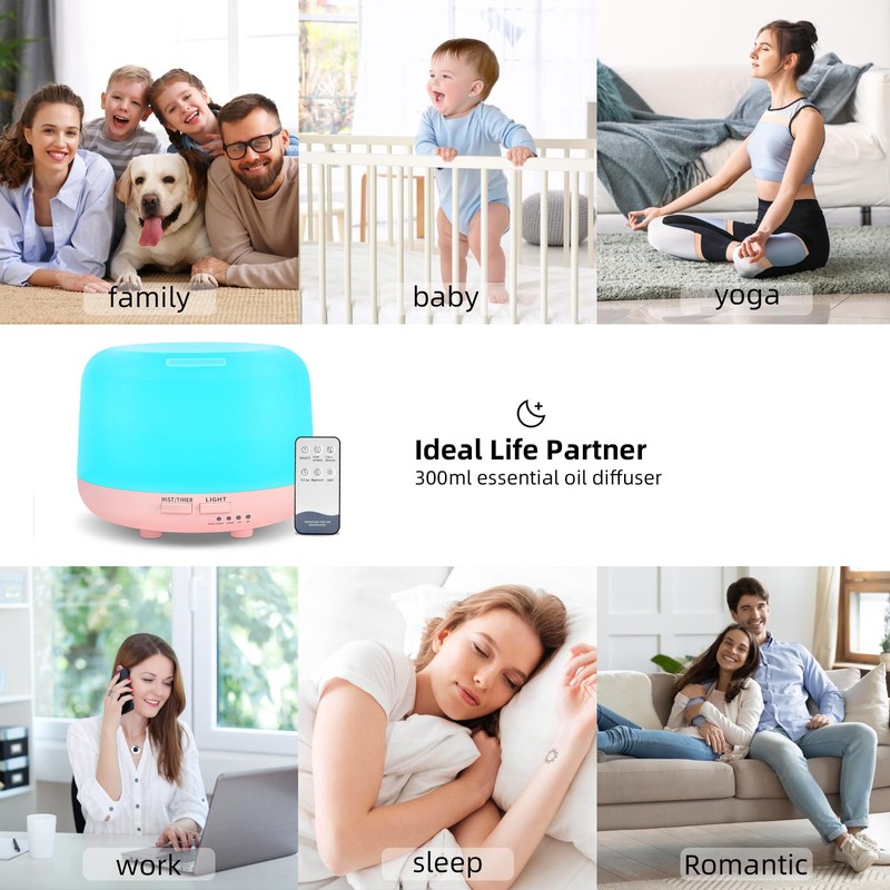 • 300ML Compact Size: Our essential oil diffuser uses ultrasonic technology,compact in size, making it easy to place on bedside tables in bedrooms, tables in rooms, and countertops in offices. Safe and convenient to use
