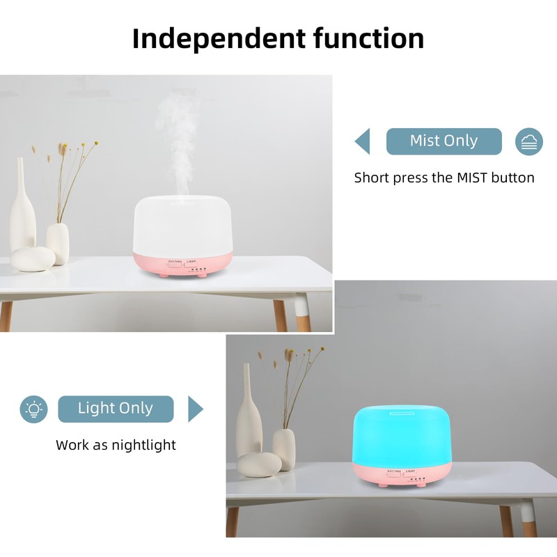 • 7 Color LED Lights:The diffuser offers 7 soothing colors of ambient light, each light color has two adjustable brightness levels bright and dim, or you can set the light to automatically change colors or fix it to a single color of your choice. The lights can be turned on or off independently
