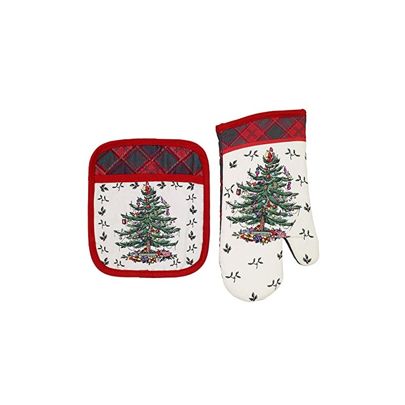 Spode - 2pc Kitchen Set, Oven Mitt & Pot Holder, Holiday Home Decor Christmas Tree Tartan Collection