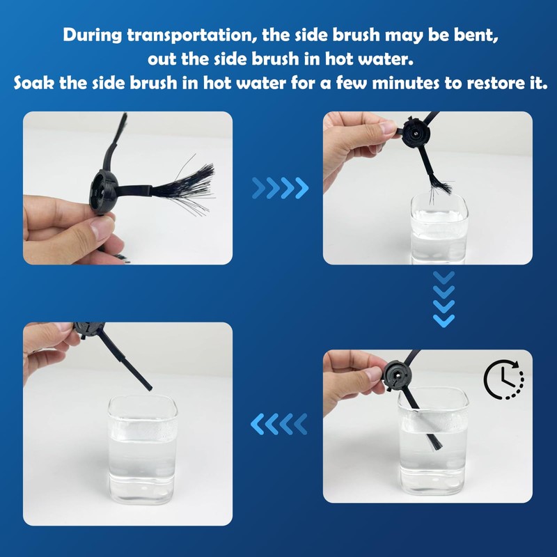 - Warme Tipps: W?hrend des Transports kann die Seitenb??rste verbogen werden, legen Sie die Seitenb??rste in hei?es Wasser. Weichen Sie die Seitenb??rste f??r einige Minuten in hei?em Wasser ein, um sie wiederherzustellen.