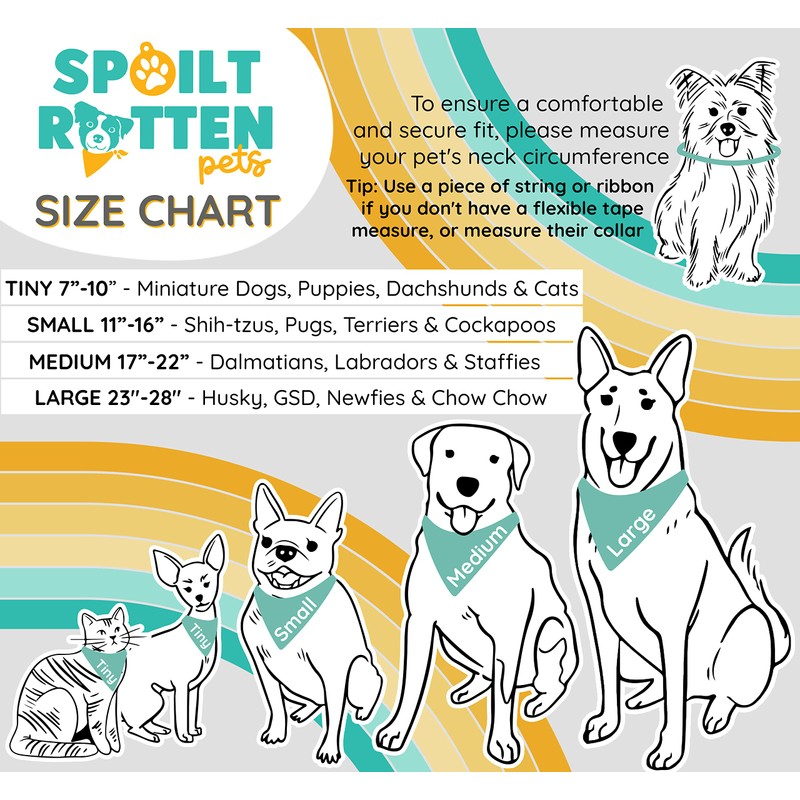 - ❤Spoilt Rotten Pets exclusive design Dog Bandana. The only bandanas with sizing options to fit all dog breeds. No fiddly knot to tie - safe popper fastening for easy wear. Our Bandana's are made here in the UK using top quality fabrics. Delightful quality cotton fabric front with soft fleece reverse - So comfortable your dog won't notice they are wearing one!