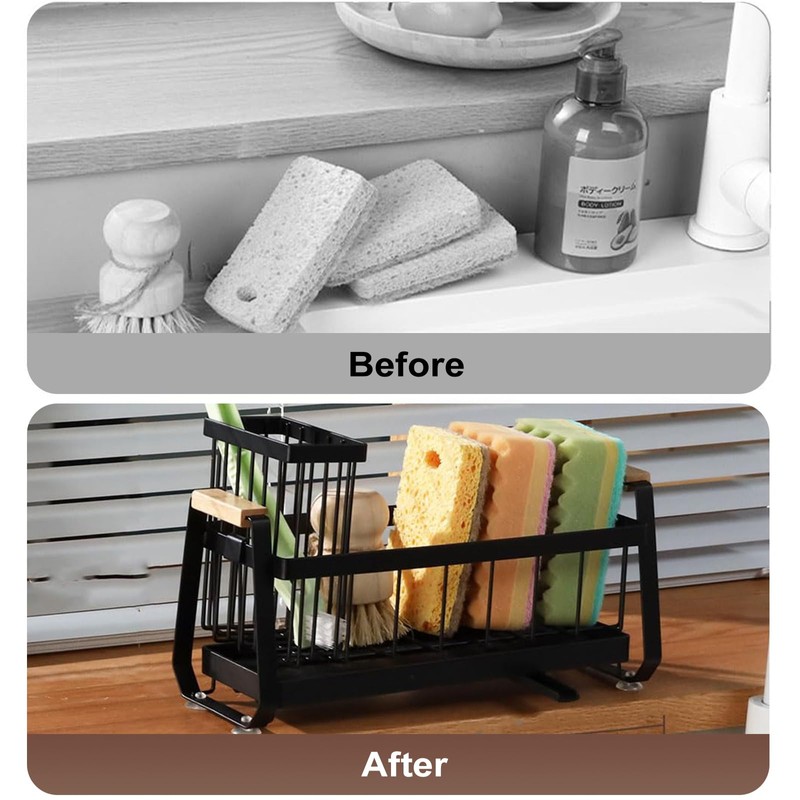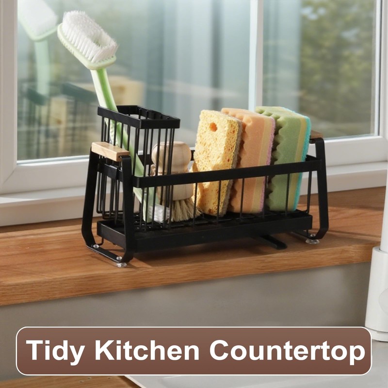 - Built-in Removable Long Basket for Classified Storage: Our kitchen countertop sponge rack has a built-in long basket storage basket, which can easily classify and store small items with long handles such as brushes, making the kitchen countertop neat and orderly, no longer need to worry about messy countertops, making your life clean and comfortable.