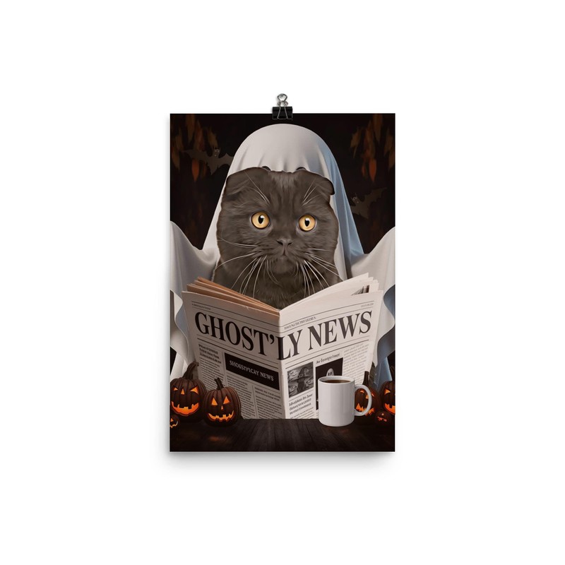 Spooky Halloween Pet and Ghost Reading Wall Art - Black Scottish Fold Cat Poster 12x18 Unframed Photo Paper - Funny Home Decor Gifts for Cat Lovers