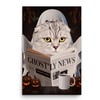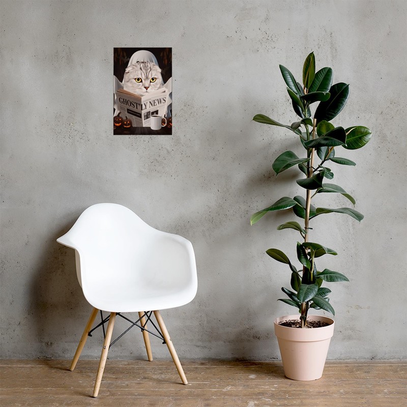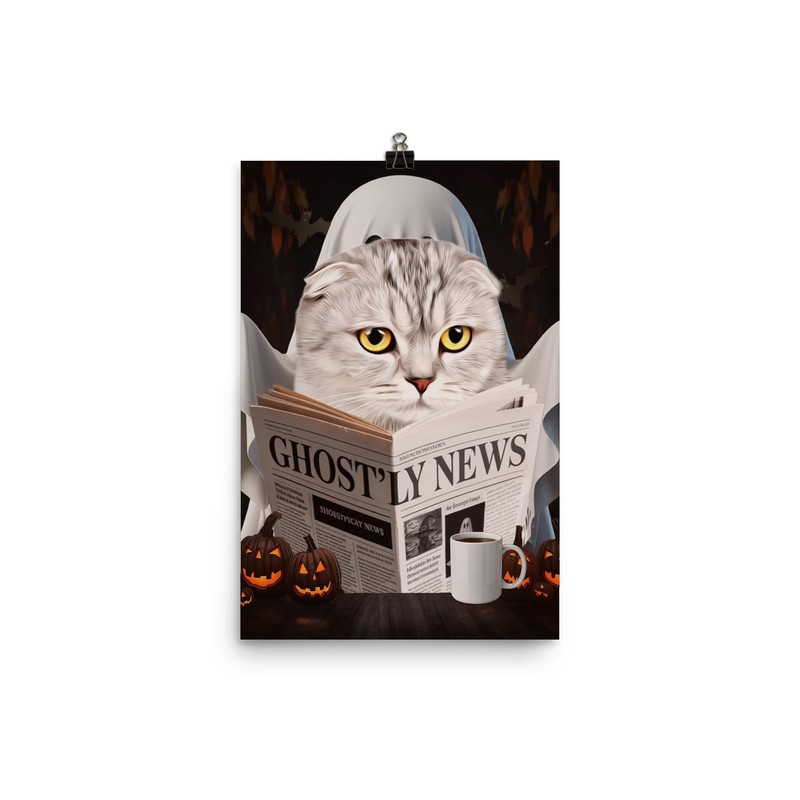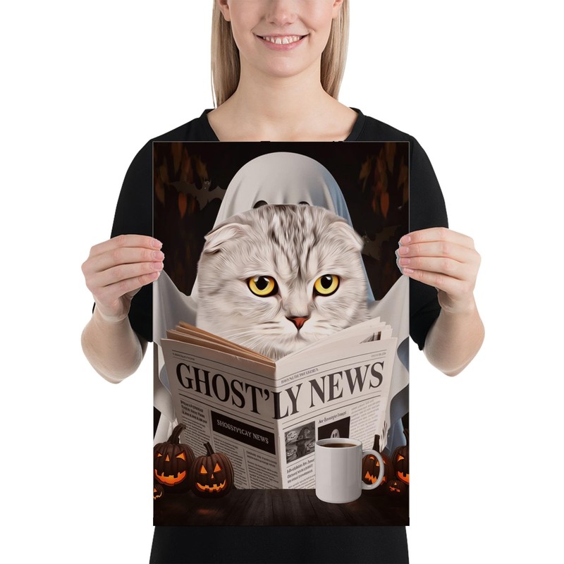 Spooky Halloween Pet and Ghost Reading Wall Art - Blue Tabby Scottish Fold Cat Poster 12x18 Unframed Photo Paper - Funny Home Decor Gifts for Cat Lovers