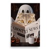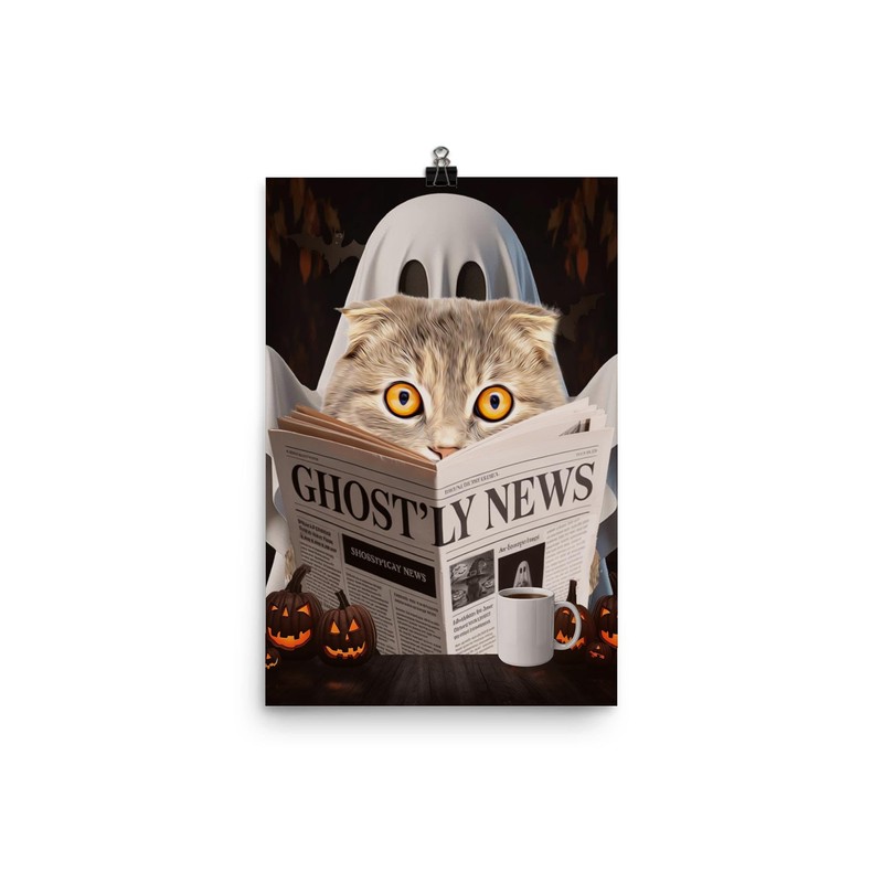 Spooky Halloween Pet and Ghost Reading Wall Art - Sable Scottish Fold Cat Poster 12x18 Unframed Photo Paper - Funny Home Decor Gifts for Cat Lovers