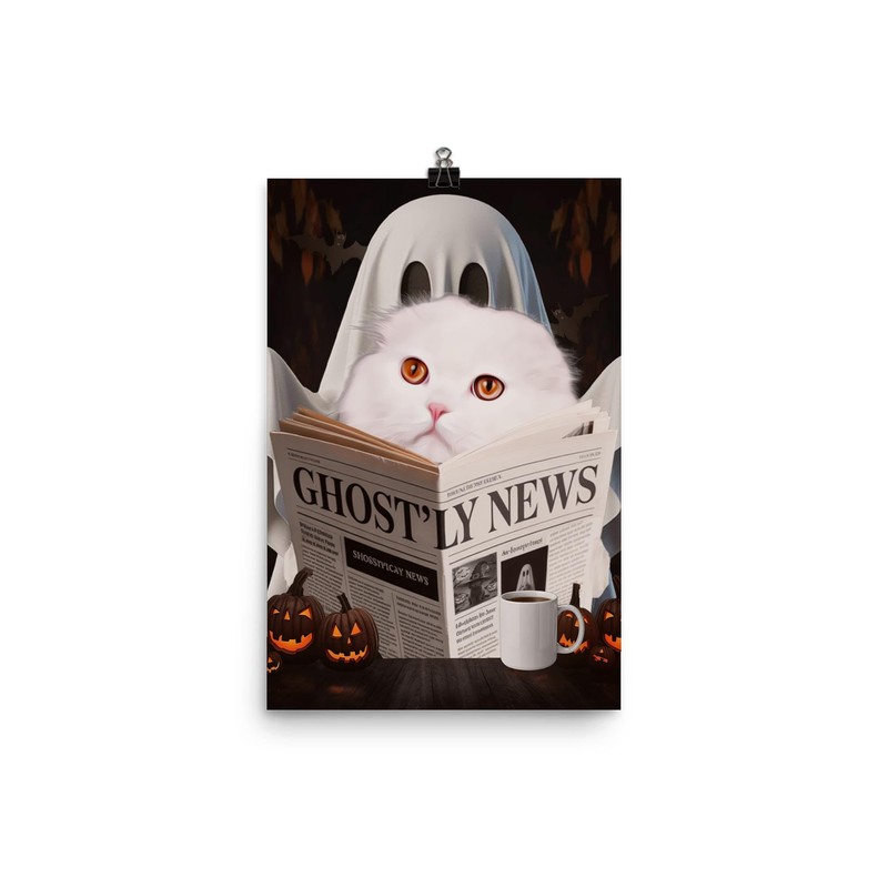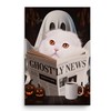 Spooky Halloween Pet and Ghost Reading Wall Art - White Scottish Fold Cat Poster 12x18 Unframed Photo Paper - Funny Home Decor Gifts for Cat Lovers