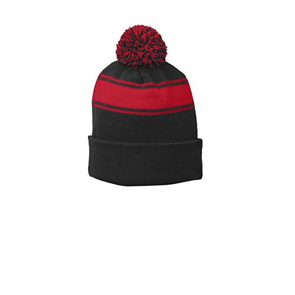 Sport-Tek Stripe Pom Pom Beanie OSFA Black/Tr Red