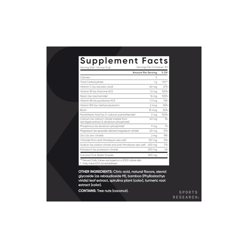 Sports Research® Hydrate Electrolytes Powder - Sugar-Free & Naturally Flavored with Vitamins, Minerals, and Coconut Water - Supports Hydration - Lemon Lime - 90 Servings