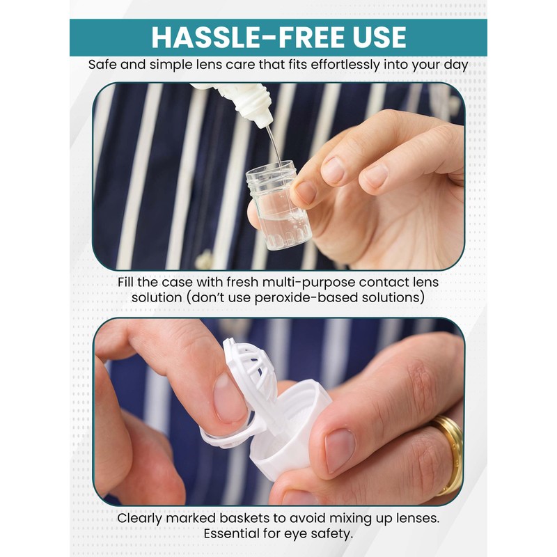• ☑️ LIGHTWEIGHT AND PORTABLE LENS CASE: These contact lens boxes are very functional, portable, and lightweight. It provides an easy and convenient solution for you to carry around during traveling or outdoor activities. This product is compatible with all brands of Multipurpose care solutions.