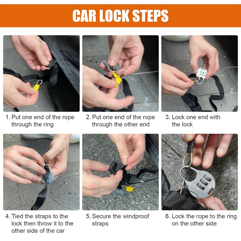 - Design Details: 1: With Door Zipper in the left for easy access. 2. Windproof Bands at front & rear to fix your car cover In heavy wind weather. 3.Reflective Stripes to remind people at the night. 4.Pretty Mirror Pockets perfectly protect your mirror form damage. 5: Adjustable elastic hems at the bottom allows you adjust the size easily. 6: Four tie-downs help you to tie the cover to four wheels, Not worry about blow away on a windy day