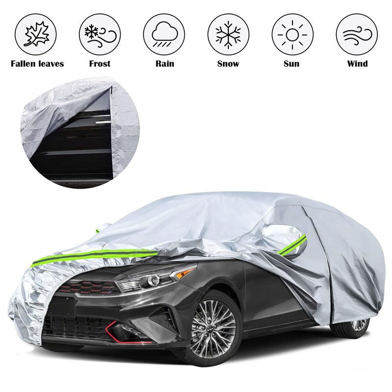sportuli Waterproof Car Covers Replace for 2009-2025 Kia Forte/K3, 6 Layers Silver All Weather Custom-fit Car Cover with Zipper Door & Windproof Bands for Snow Rain Dust Hail Protection