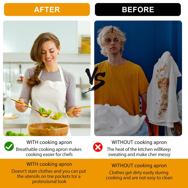- PROTECT CLOTHES - The cooking apron protects against splashes of your clothes and keeps your clothes clean. You can effectively avoid kitchen grease, spills and food stains residue on your clothes, do not need to get dirty over the clothes.