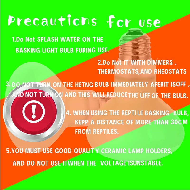 • 🦎.Note - You must use good quality ceramic lamp holders, and do not use it when the voltage is unstable. Do not use it with dimmers, thermostats, and rheostats. Do not splash water on the basking light bulb during use. Do not turn on the heat bulb immediately after turning it off, and do not turn the bulb on and off frequently. Create a refuge area for the reptile to move to in case of overheating.