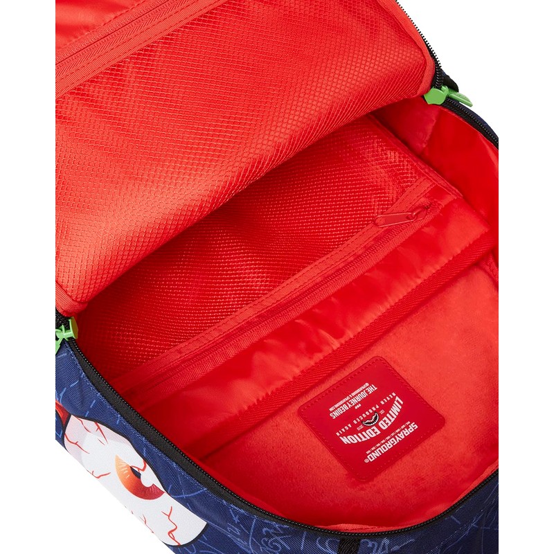 Dimensions: 18" x 6" x 11.5" Front zipper pocket Side pockets Zippered Stash pocket Separate velour sunglass compartment Ergonomic mesh back padding Adjustable Straps for custom sizing Gold zippers with metal hardware Metal "Sprayground Authentic" badge Slide through back sleeve connects to carry-on luggage to free your hands