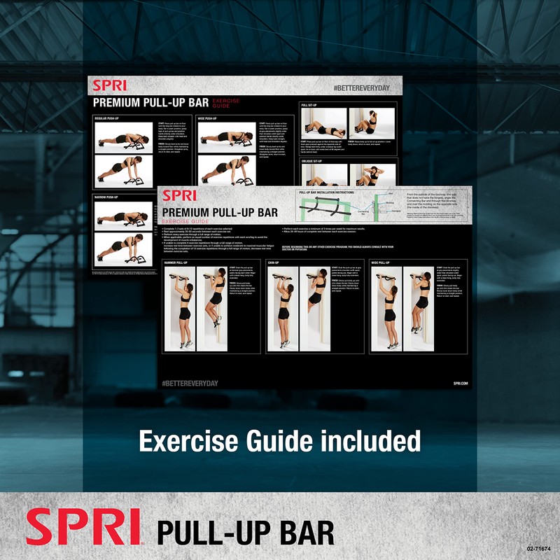 - Exercise Guide - The multi grip pull up bar includes a detailed guide to help you get started using the pull up bar for traditional doorway pull-up workouts or as a push up system for floor exercises. Includes mounting hardware.