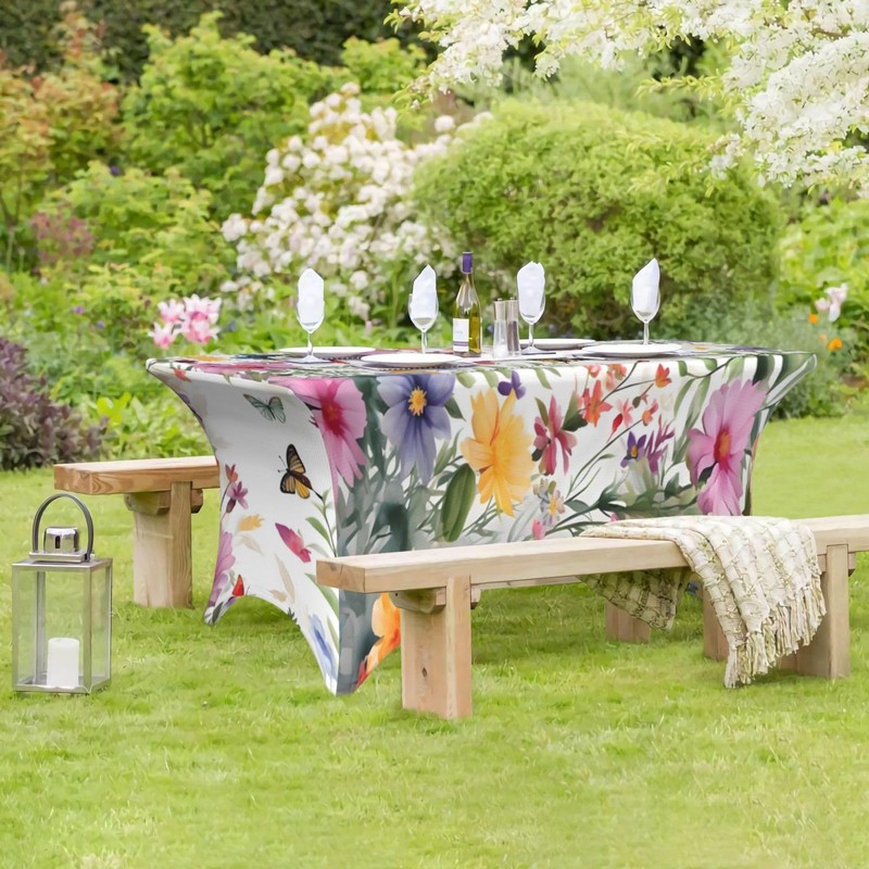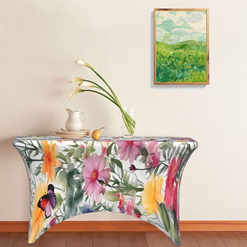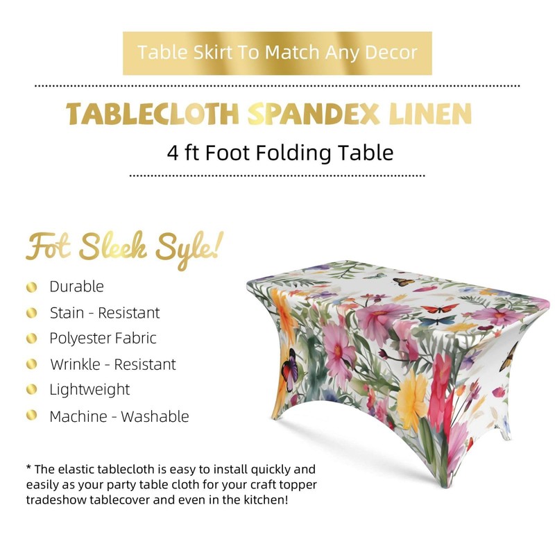 Spring Flower Butterfly Spandex Tablecloth for Rectangular Tables, Fitted Tablecloth 4FT Stretch Spandex Table Covers for Folding Tables, Wrinkle Resistant Table Protector for Party Weddings BBQ