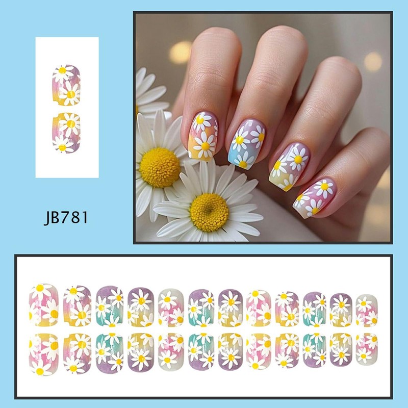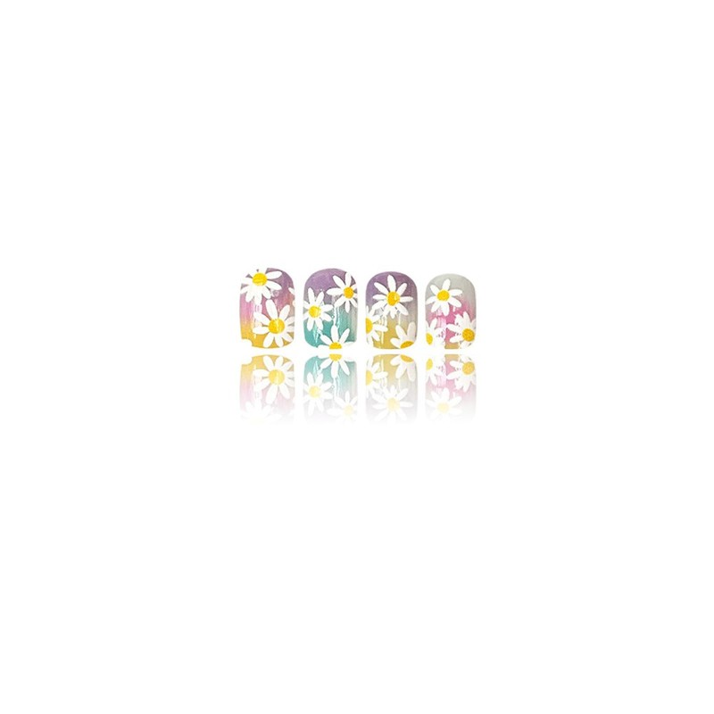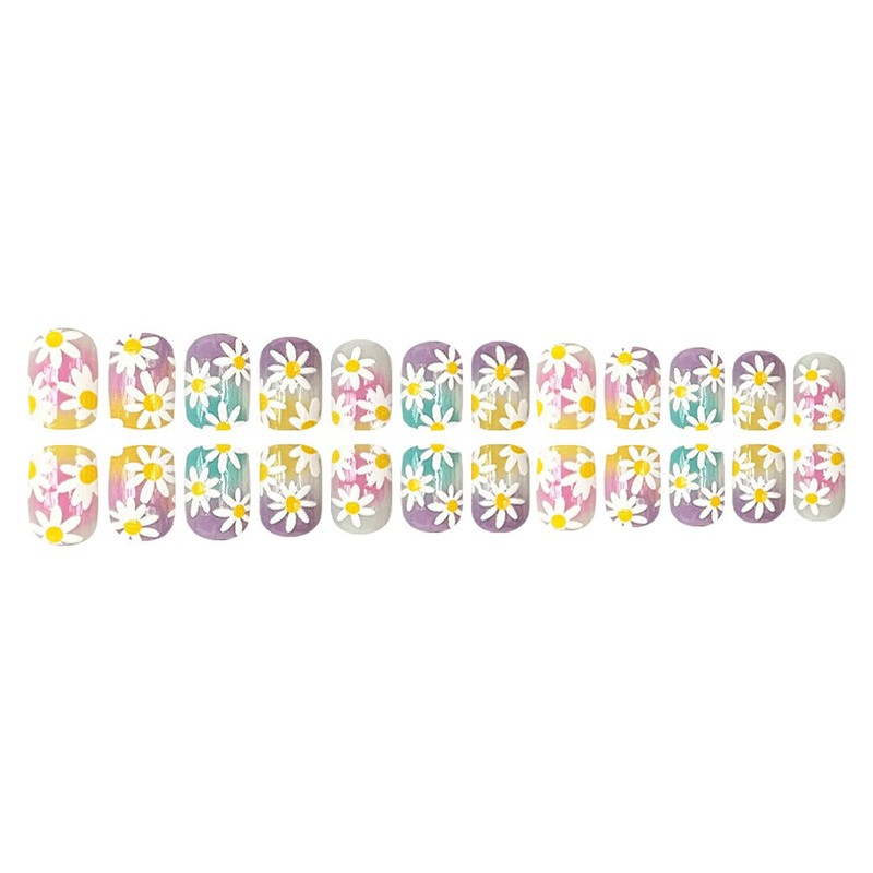 Spring Summer Press on Nails Gradient Daisy Stick on Nails Colorful Flowers Acrylic Glue on Nails Medium Square Fake Nails Glossy Artificial Nails Full Cover False Nails Kit for Women Girl 24Pcs