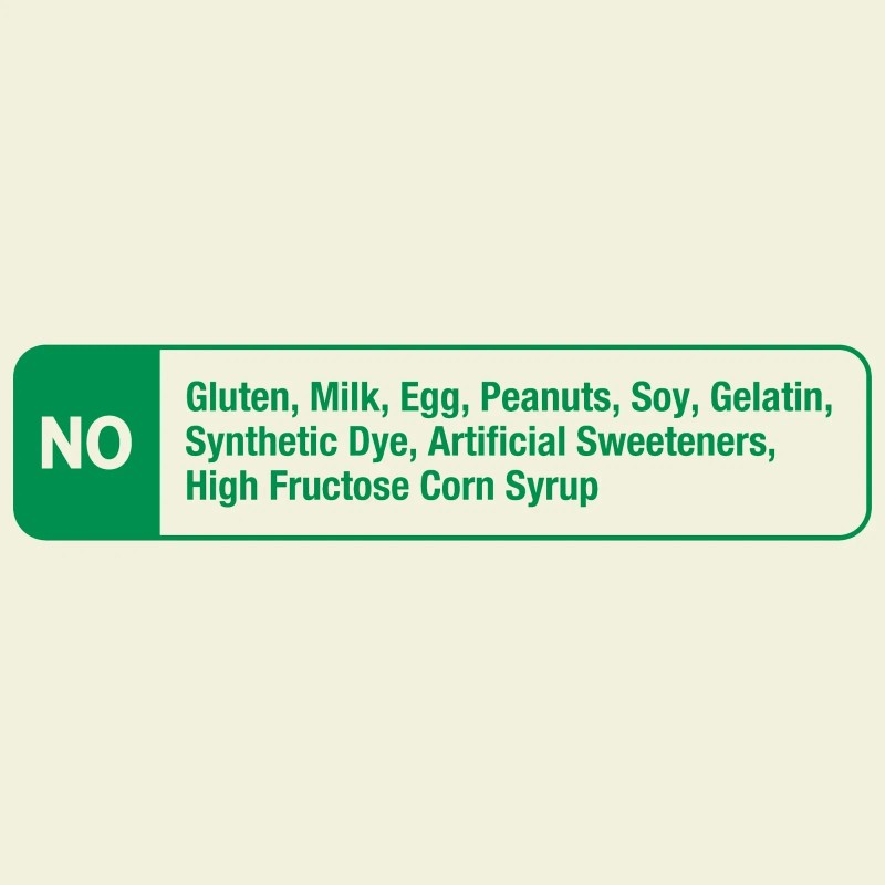 • Features: Gelatin-Free, Gluten-Free, No Artificial Sweeteners, No High Fructose Corn Syrup, Peanut-Free, Soy-Free, Milk-Free