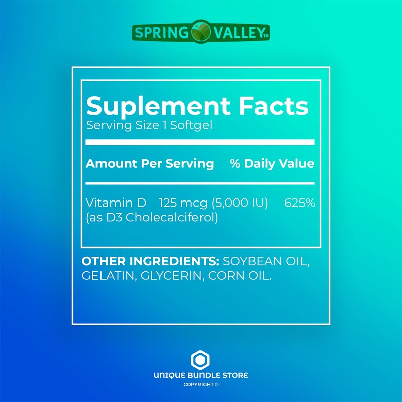 - Get your daily dose of Spring Valley D3 vitamin 5000 iu with our high-potency supplement! Each serving provides 5000 IU of D3 vitamin, the ideal amount for supporting bone health, immune function, and mood regulation