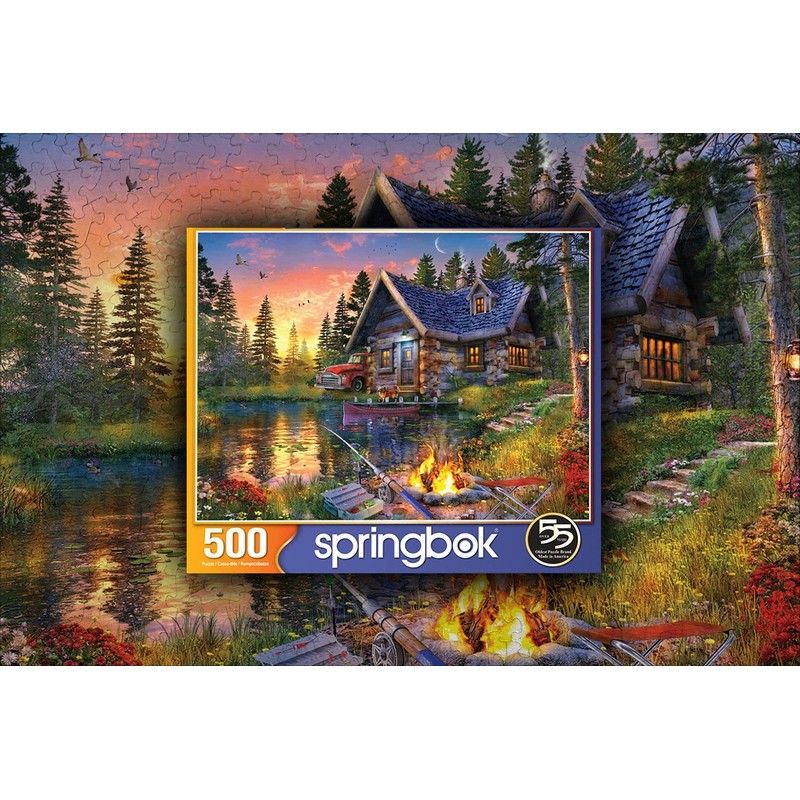 Springbok Sun Kissed Cabin 500 Piece Jigsaw Puzzle for Adults Features a Fishing Cabin by The Lake in a Colorful Illustration