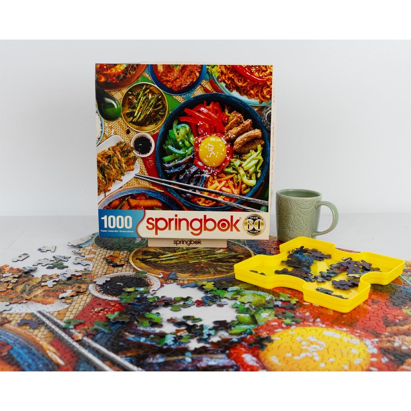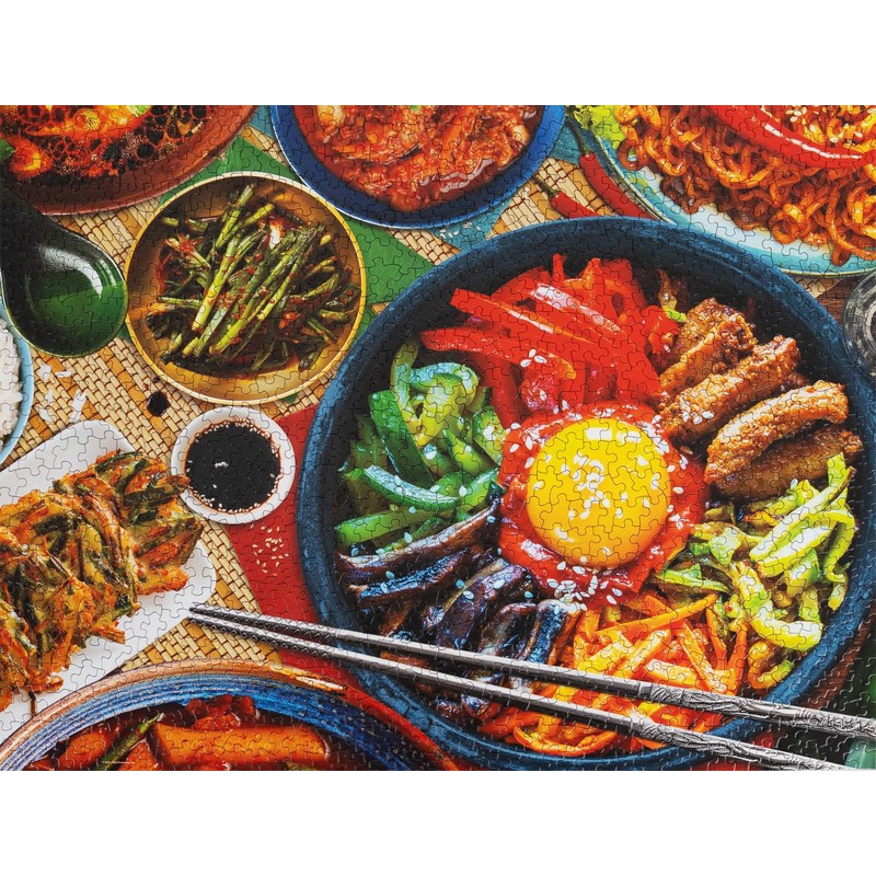 - Savor the vibrant flavors of Korean cuisine with Springbok's 1000-piece jigsaw puzzle, featuring a mouthwatering spread of traditional dishes. At the heart of the puzzle is a beautifully arranged bibimbap bowl, surrounded by an array of spicy kimchi, crispy pancakes, savory noodles, and flavorful side dishes. Designed by artist Alondra Salgado at Springbok Studios, the bold colors, rich textures, and intricate details make this a delightful and appetizing challenge for food lovers and puzzle enthusiasts alike.