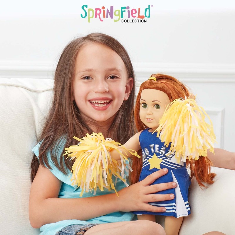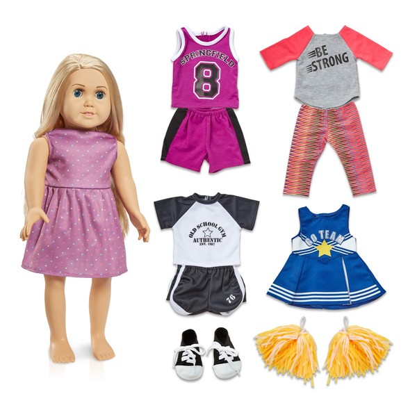 - Complete Sporty set! This Springfield doll sporty set includes a basketball tank and shorts, soccer top and shorts, “be strong” active top and pants, cheerleader dress, poms, and black sneakers that complement each of the looks.