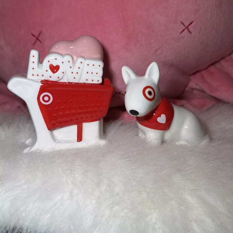 The Target Spritz Valentine’s Day Ceramic LOVE Cart & Bullseye Dog 2025 Set Of 2 is a set of small figurine featuring the iconic Target Bullseye Dog and a red, white, and pink themed cart adorned with hearts and the word "LOVE." These adorable ceramic pieces are designed for Valentine's Day, making it a perfect decoration for the holiday season. The figurines captures the essence of love and romance with its charming design, suitable for any room in your home to add a touch of seasonal cheer.