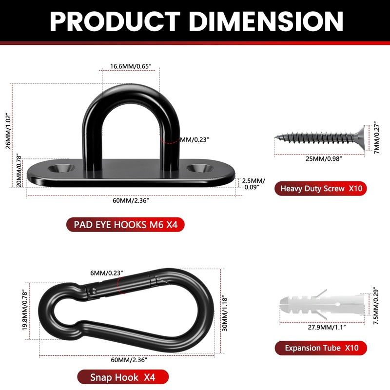 - Packaging Information: 4pcs M6 eye plates, 4pcs M6 hooks, and 10pcs installation screws with expansion tubes. If there are ever any issues when receiving, contact us
