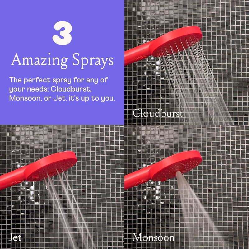 - 3 SPRAY FUNCTIONS AND A PAUSE BUTTON - 3 different shower sprays plus a super practical pause button, all controlled from the shower handheld unit, make it easy as can be to change the functions without having to reach up to the neck of the shower or fiddle with the temperature. The Monsoon, a strong full funnel spray perfect for getting shampoo out of your hair. Cloudburst will surround you with a relaxing rainfall type spray. Use Jet when you want a firm massage to hit just the right spots! Pause the stream to a trickle right from the handheld to conserve water, this comes in super handy when bathing kids and washing pets.