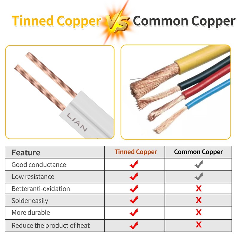 • High Quality & Safety: Made of copper strands with PVC VW-1 material coating, 41 tiny lines twined together, the cross-sectional area is 2 x 0.824mm². The wire is flame retardant, anti-aging, acid and alkali resistant, and moisture resistant