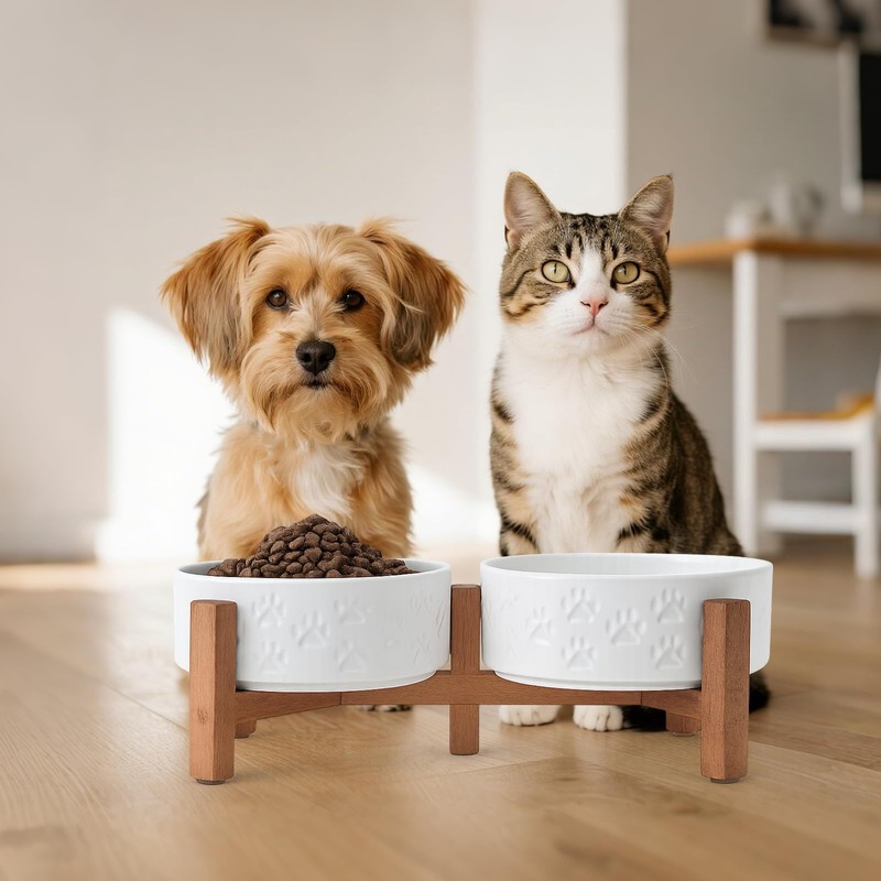 SPUNKYJUNKY Ceramic Elevated Dog Bowl Set with Acacia Wood Stand for Food and Water for Cats and Small Dogs (13.52 OZ, White, Dog Paw Pattern)