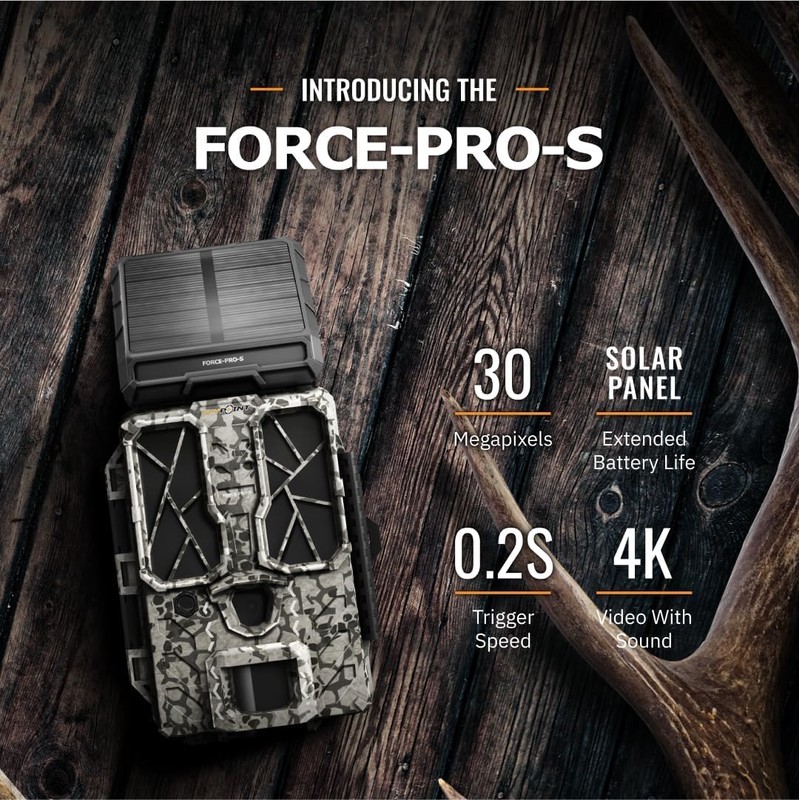 SPYPOINT Force-PRO-S Solar Trail Camera, Solar Panel, 0.2S Trigger Speed, 90ft Flash Range, 4K/2K/1080p Video Modes, 30MP Photos, Internal Battery Supply with Backup + 32GB SD Card + Strap