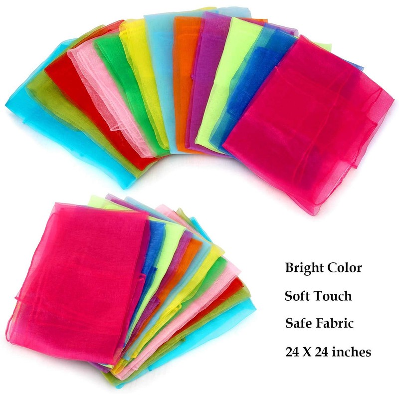 24 Pieces square scarves, used as dance scarf, music play scarf, music movement scarf, magic trick performance scarf. for pre-school kids movement scarves, group dance scarf and many stage performance. Also can be used for dressing accessories and bags decorations.