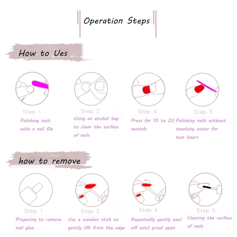 • How to use:clean and trim your short square toenails, then choose the appropriate size and use our provided jelly glue or your own glue to gently press for 15 seconds to complete.
