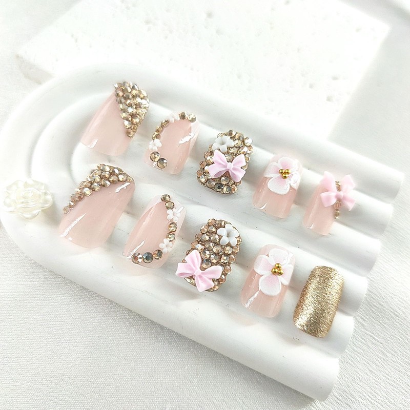 Square Press on Nails Medium Fake Nails with 3D Rhinestones Bow Glitter Flower Design French Tip Nails Press ons Glossy Glue on Nails Pink Acrylic Nails Gold False Nails Stick on Nails for Women 24Pcs