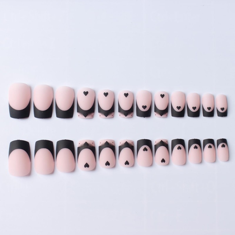 Square Press on Nails Medium French Tip Press on Nails Black Heart Deign, Matte Nude Pink Fake Nails Gel Acrylic Nails Glue Stick on Nail Tip Reusable Natural Fit Valentine's Day False Nails Kit 24Pcs