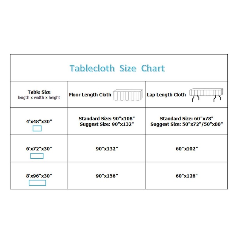 - Size: Please measure the size of your table before purchasing. The length of a floor-touching tablecloth should be the length of the table plus twice the height of the table. The pictures are for your reference only. Please refer to the size chart to select the most suitable tablecloth.