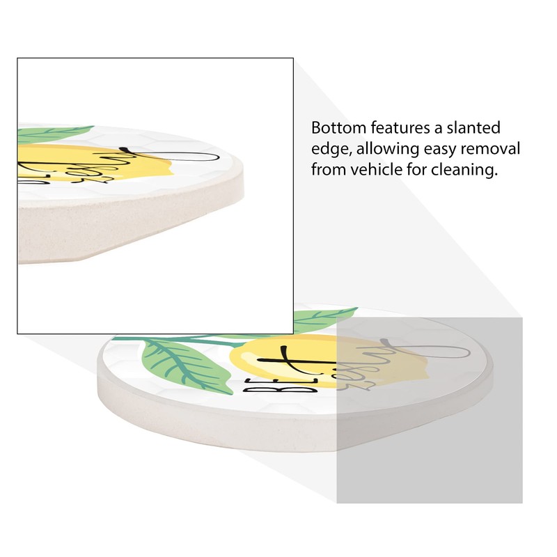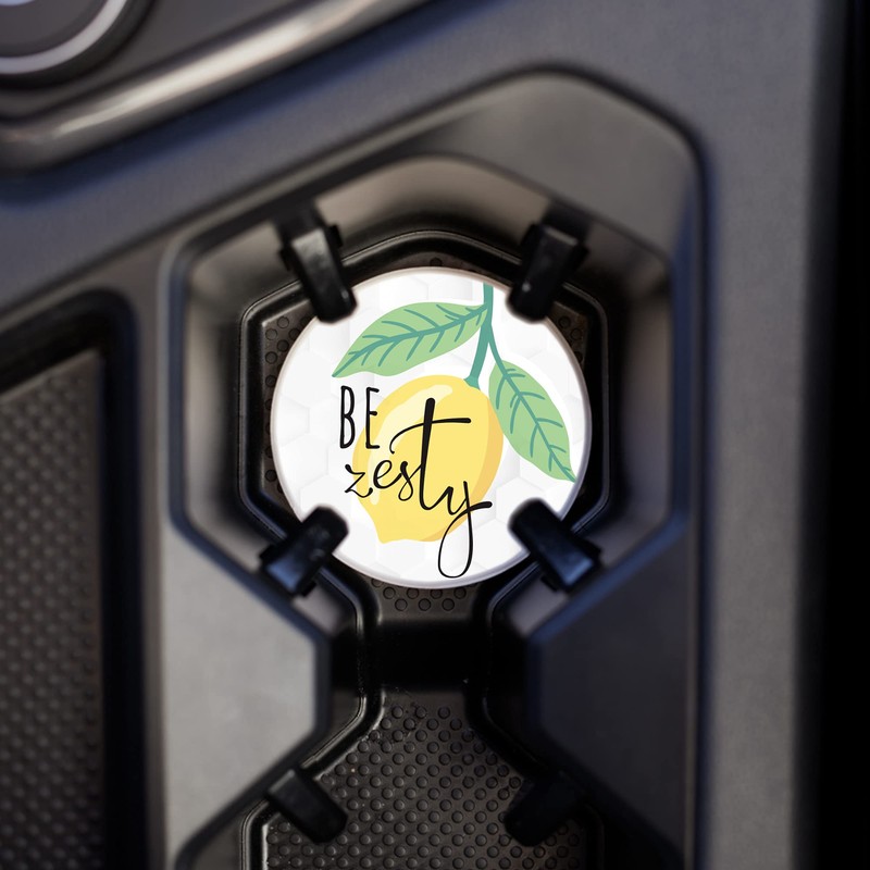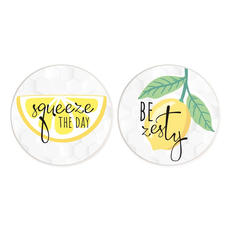 Comes as a coordinating pack of 2; Sentiment reads "Squeeze The Day" and "Be Zesty" with yellow background and lemon design; Laser printed with heat for more accurate color saturation. Coasters are made of absorbent ceramic with a slanted edge on the bottom, allowing for easy removal from the vehicle for cleaning. Each coaster measures approximately 2.75 inches in diameter and fits standard size cup holders in most center consoles. Designed and printed in the USA; Great for gifting as a birthday, graduation, or anytime gift to keep a tidy care with a splash of encouragement. Individually wrapped in protective packaging; Ready for thoughtful gifting and inspiration.