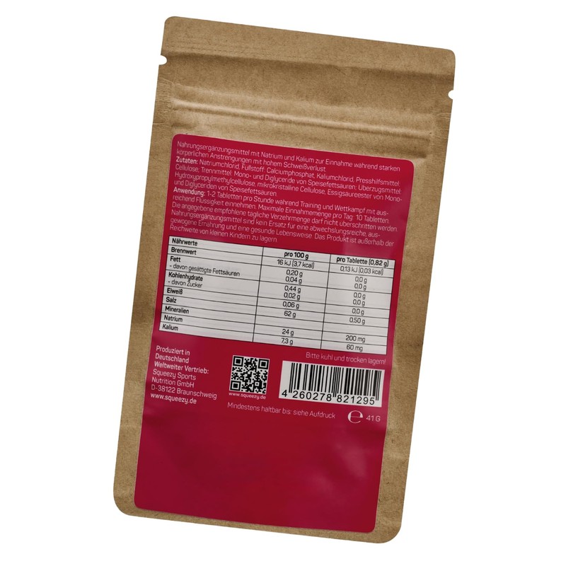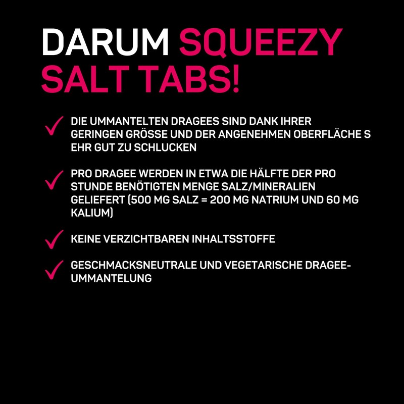 - Regeneration after sports – by filling the mineral storage of your body, Squeezy Salt Tabs effectively help you regenerate after physically strenuous sports sessions.