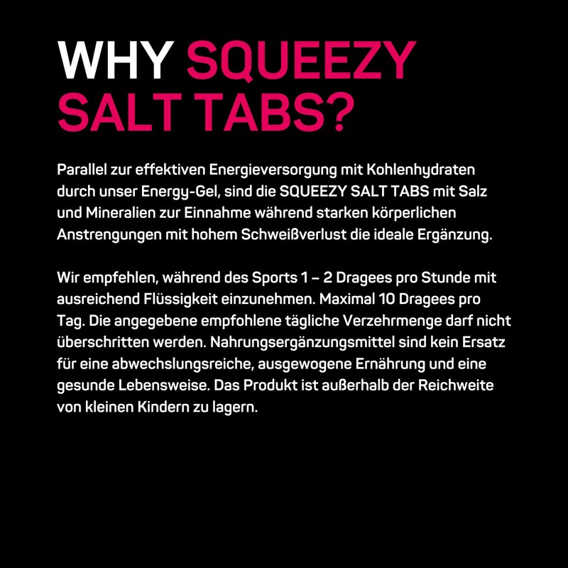 - Fast electrolyte supply: Squeezy salt tabs are the ideal companion for intense physical exertion to quickly replenish your mineral stores and optimally supply your body with electrolytes.