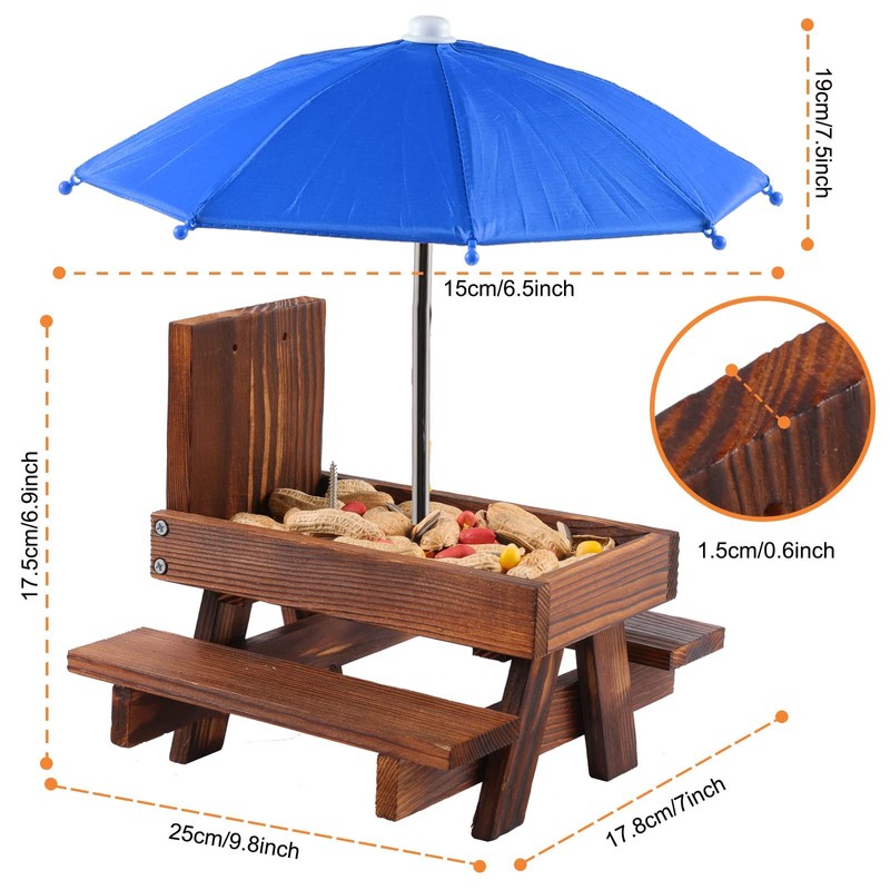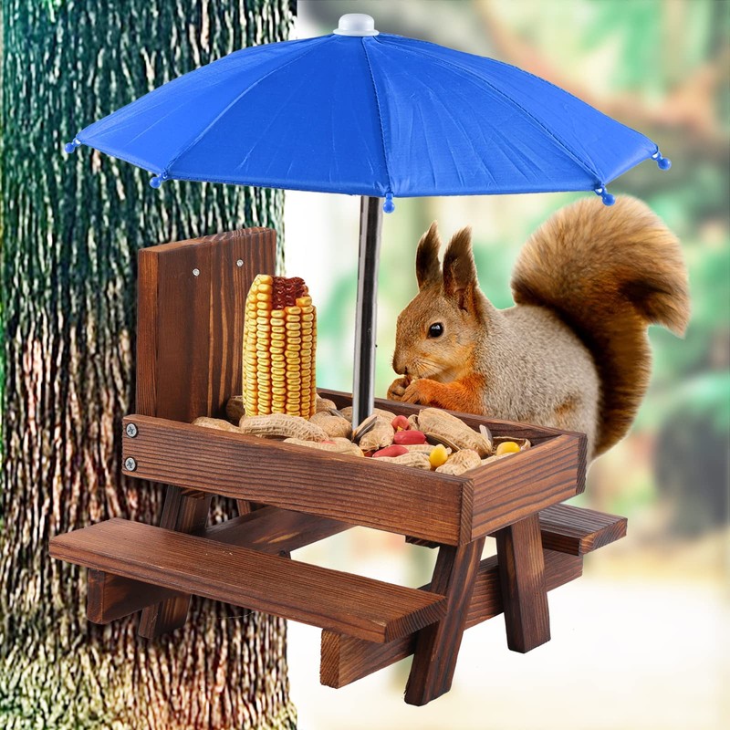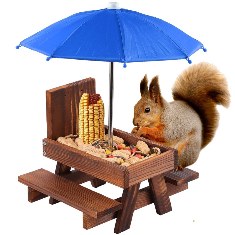 - 🐿️CUTE SQUIRREL FEEDER TABLE WITH UMBRELLA -- Beautiful squirrel picnic feeder table for your playful neighborhood squirrels to sit. Cute little critters snacking at the local picnic table will be sure to cheer anyone up!