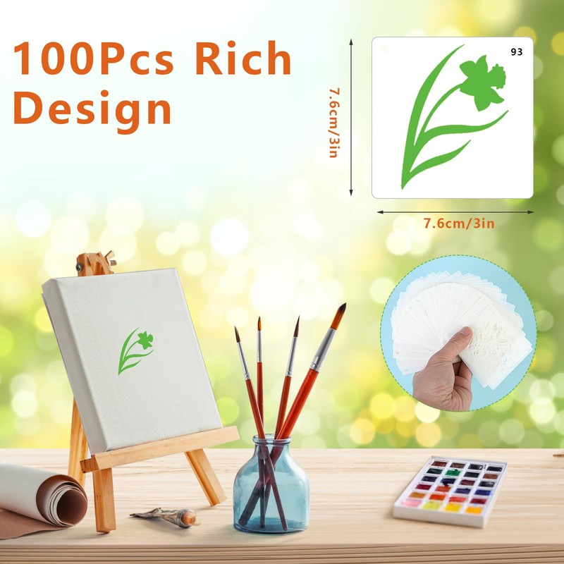 - 100-piece small flower stencil set: the stencils show a variety of different flowers and plants, including roses, sunflowers, daisies and tropical leaves. 100 pieces that do not repeat, so children can create a wide range of designs and experiment with different colours and combinations.